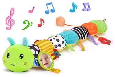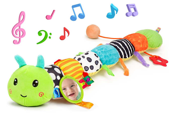 Este juguete es un compañero de desarrollo increíblemente versátil que combina las funciones de peluche, juguete musical, sonajero y juguete de crujido ("crinkle").