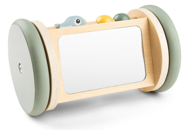 Este espejo de actividades rodante está diseñado para estimular la curiosidad y fomentar el desarrollo físico y motor del bebé a través del juego activo.