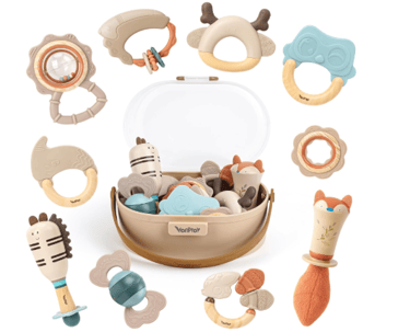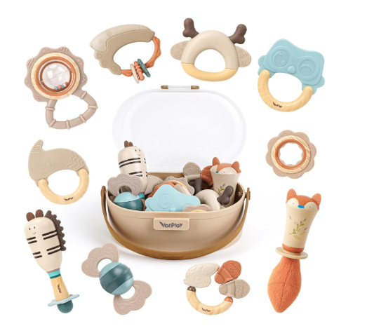 Estimulación Multisensorial y Motora: Las diferentes formas (anillos, animales, mangos fáciles de agarrar) y los colores neutros apelan a los sentidos del tacto, el sonido y la vista. Esto ayuda a desarrollar las habilidades motoras finas y la coordinación ojo-mano.