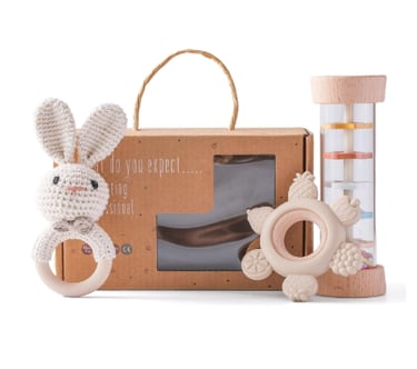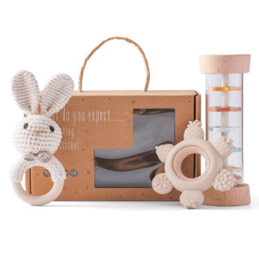 Este set esencial de juguetes de madera combina un sonajero de ganchillo, un creador de sonido de lluvia y un mordedor de silicona, enfocándose en la calma, la estimulación auditiva y el alivio de la dentición.