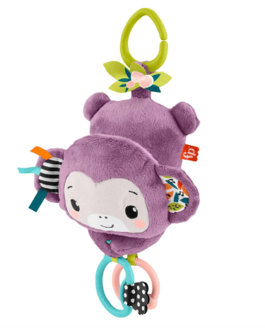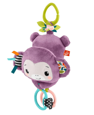 Música Interactiva: Al tirar y soltar los aros de traqueteo, el bebé activa la canción favorita "Purple Monkey" (conocida del Piano Gimnasio Deluxe de Fisher-Price) y otros sonidos divertidos.